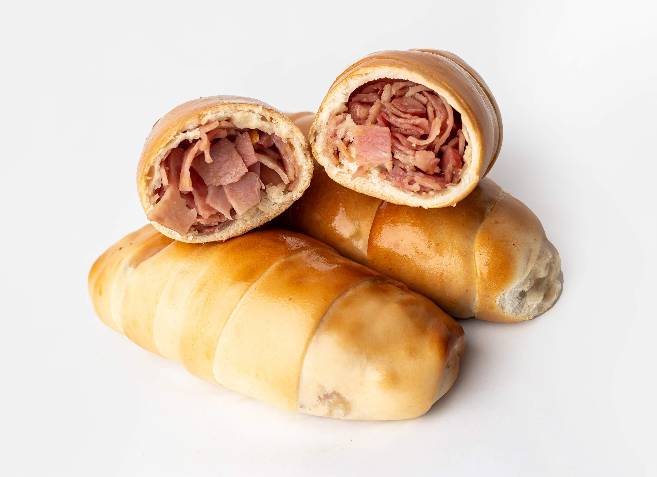 Cachitos precocidos a granel, rellenos de bacon y queso gouda.